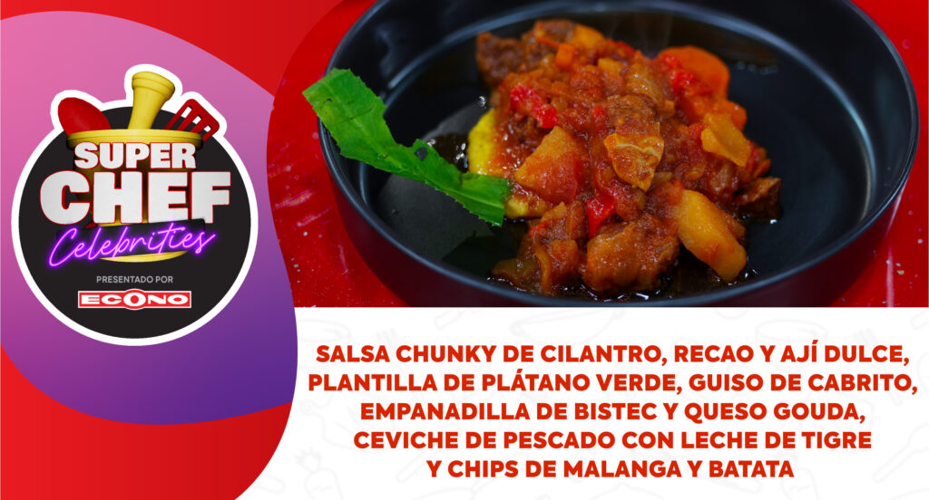 Salsa Chunky de Cilantro, Recao y Ají Dulce, Plantilla de Plátano Verde, Guiso de Cabrito, Empanadilla de Bistec y Queso Gouda, Ceviche de Pescado con Leche de Tigre y Chips de Malanga y Batata