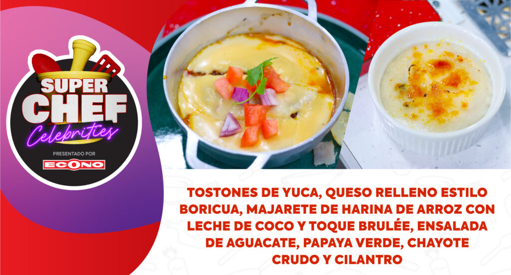 Tostones de Yuca, Queso Relleno estilo Boricua, Majarete de Harina de Arroz con Leche de Coco y Toque Brulée, Ensalada de Aguacate, Papaya Verde, Chayote Crudo y Cilantro