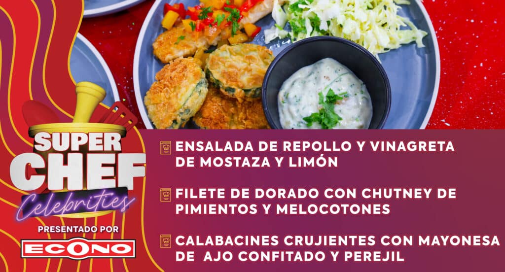 Ensalada de Repollo y Vinagreta de Mostaza y Limón, Filete de Dorado con Chutney de Pimientos y Melocotones, Calabacines Crujientes con Mayonesa de Ajo Confitado y Perejil