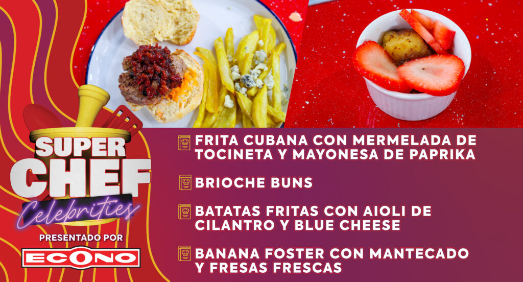 Frita Cubana con Mermelada de Tocineta y Mayonesa de Paprika, Brioche Buns, Batatas Fritas con Aioli de Cilantro y Blue Cheese, Banana Foster con Mantecado y Fresas Frescas