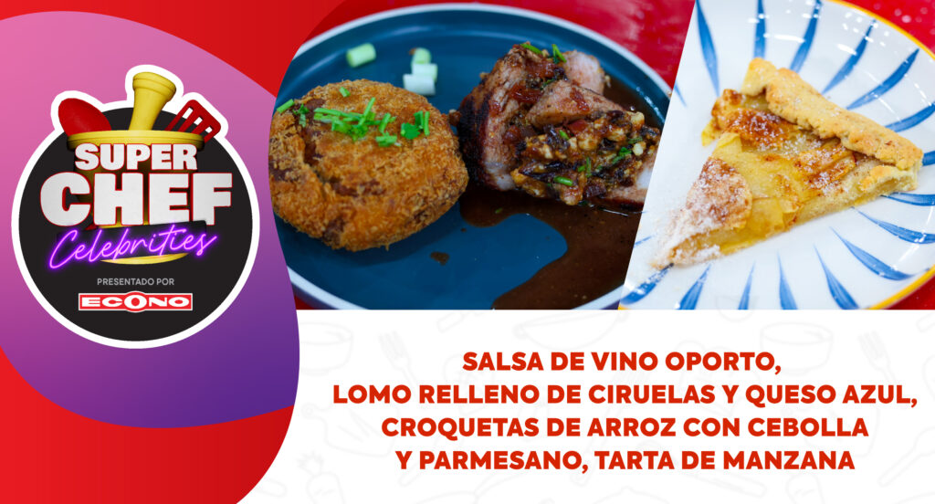 Salsa de Vino Oporto, Lomo Relleno de Ciruelas y Queso Azul, Croquetas de Arroz con Cebolla y Parmesano, Tarta de Manzana