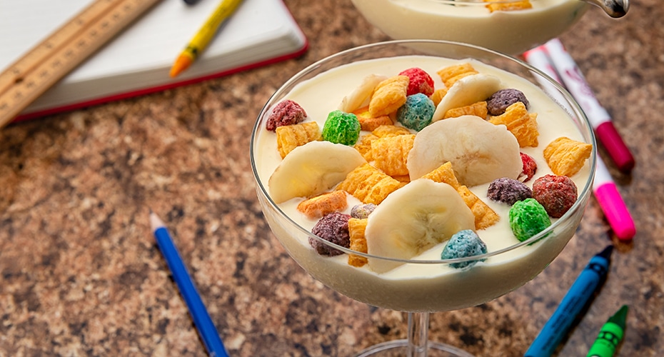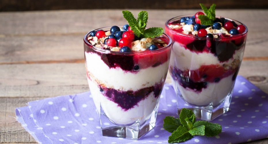 Yogurt con pudín, frutas y bizcocho Ver más »