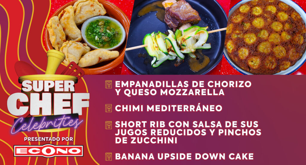 Empanadillas de Chorizo y Queso Mozzarella, Chimi Mediterráneo, Short Rib con Salsa de sus Jugos Reducidos y Pinchos de Zucchini, Banana Upside Down Cake