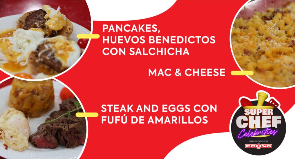 Pancakes con Huevos benedictinos con salsa holandesa & Steak and eggs con Fufú de amarillos & Mac and Cheese Super Chef Celebrities – Lunes, 3 de Junio Pancakes con Huevos benedictinos con salsa holandesa & Steak and eggs con Fufú de amarillos & Mac and Cheese Ver más »