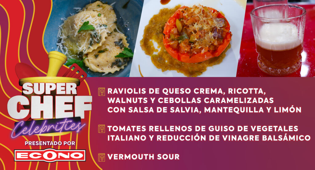 Raviolis de Queso Crema, Ricotta, Walnuts y Cebollas Caramelizadas con Salsa de Salvia, Mantequilla y Limón, Tomates Rellenos de Guiso de Vegetales Italiano y Reducción de Vinagre Balsámico, Vermouth Sour