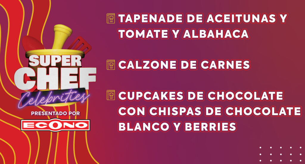 Tapenade de Aceitunas, Tomate y Albahaca, Calzone de Carnes, Cupcakes de Chocolate con Chispas de Chocolate Blanco y Berries