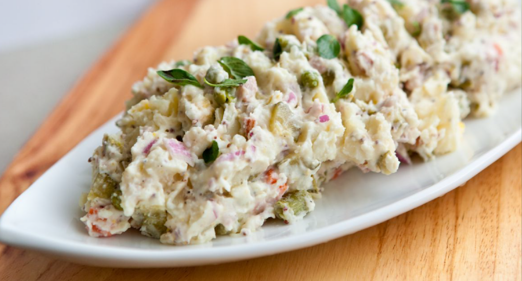 Loaded batata chips con bacon, buffalo, ranch y blue cheese; Jalapeño poppers con honey mustard; Double smash burger con queso americano, cebollas caramelizadas y pepino; Sliders de pollo frito con ensalada de repollo; Crepa rellena de dulce de leche, guineo con nueces tostadas y crema batida