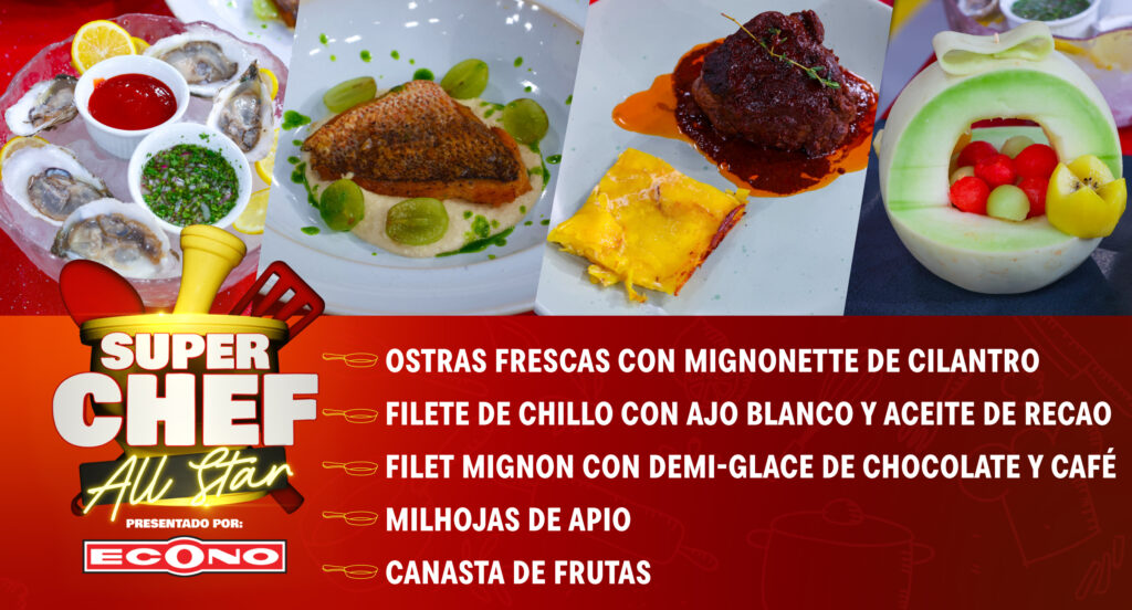 Ostras frescas con mignonette de cilantro; Filete de chillo con ajo blanco y aceite de recao; Filet mignon con demi-glace de chocolate y café; Milhojas de apio; Canasta de frutas