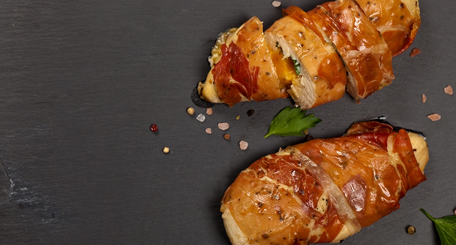 Eleva tus cenas con pechuga de pollo con esta receta rellena de queso y envuelta en prosciutto.