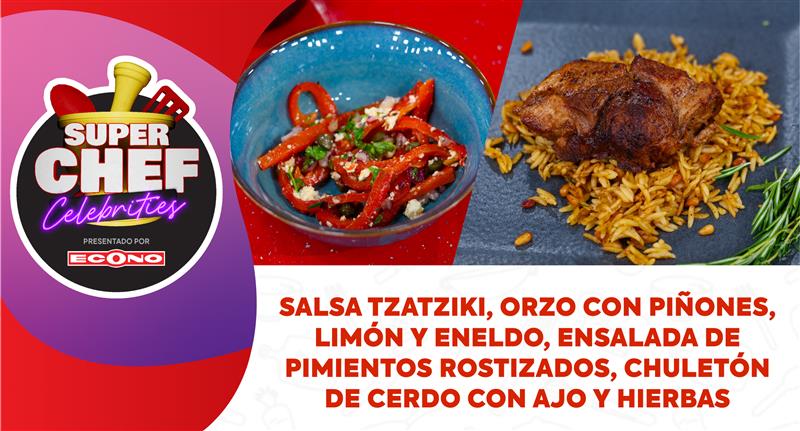 Salsa Tzatziki, Orzo con Piñones, Limón y Eneldo, Ensalada de Pimientos Rostizados, Chuletón de Cerdo con Ajo y Hierbas