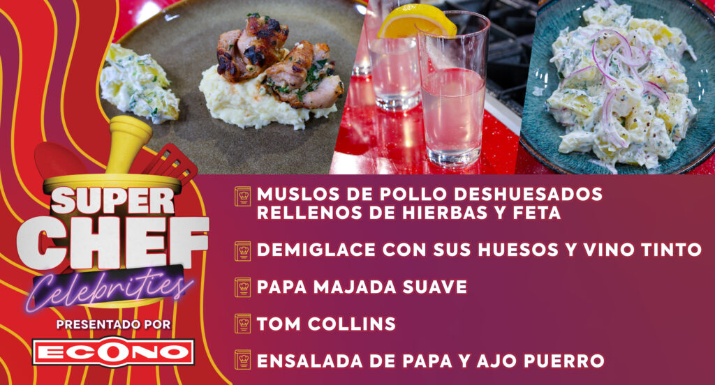 Muslos de Pollo Deshuesados Rellenos de Hierbas y Feta, Demiglace con sus Huesos y Vino Tinto, Papa Majada Suave, Tom Collins, Ensalada de Papa y Ajo Puerro
