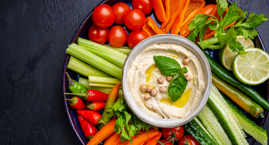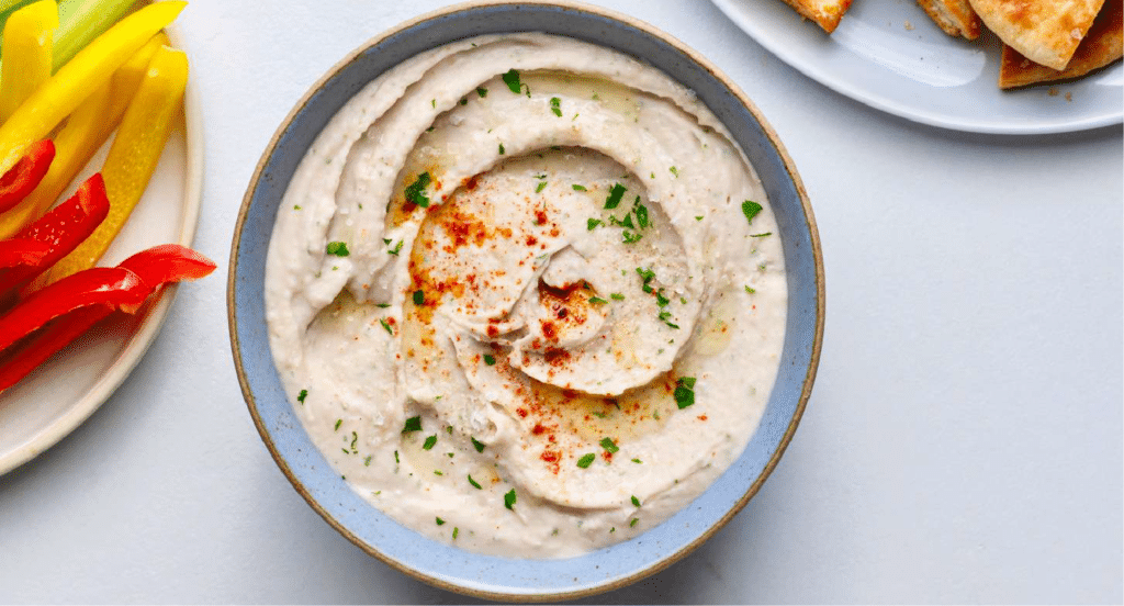 Hummus con Pan Pita, Cuscus Cremoso de Limón, Kebab de Cordero Tzatziki, Uvas Asadas con Miel, China y Tomillo con Yogurt y Pan Dulce