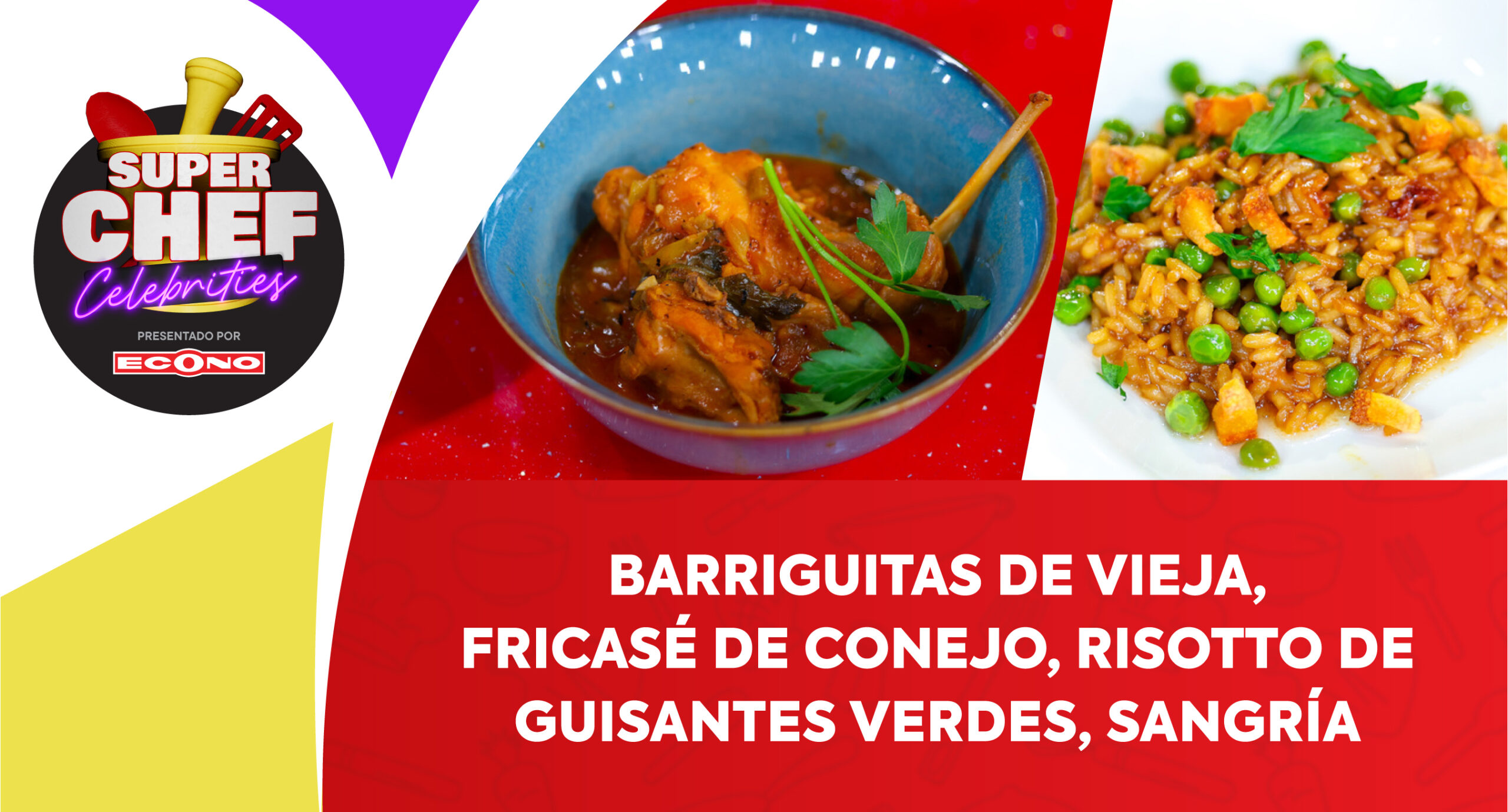 Barrriguitas de Vieja, Fricasé de Conejo, Rissoto de Guisantes Verdes, Sangría