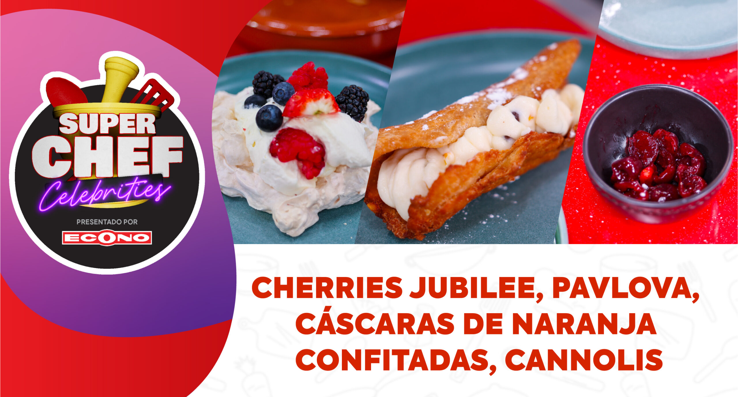 Cherries Jubilee, Pavlova, Cáscaras de Naranja Confitadas, Cannolis