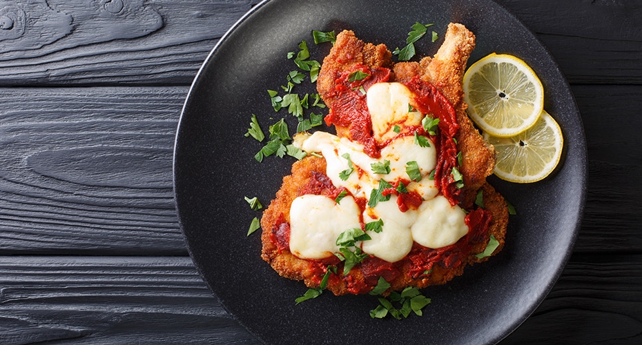 • Pasa las chuletas a una bandeja para hornear y cúbrelas con queso mozzarella y queso parmesano. Lleva la bandeja al horno con la parrilla en la parte baja y deja cocinar por 5 a 6 minutos aproximadamente. Sirve con arroz y papitas fritas, tostones, ensalada de papas ¡o lo que gustes!