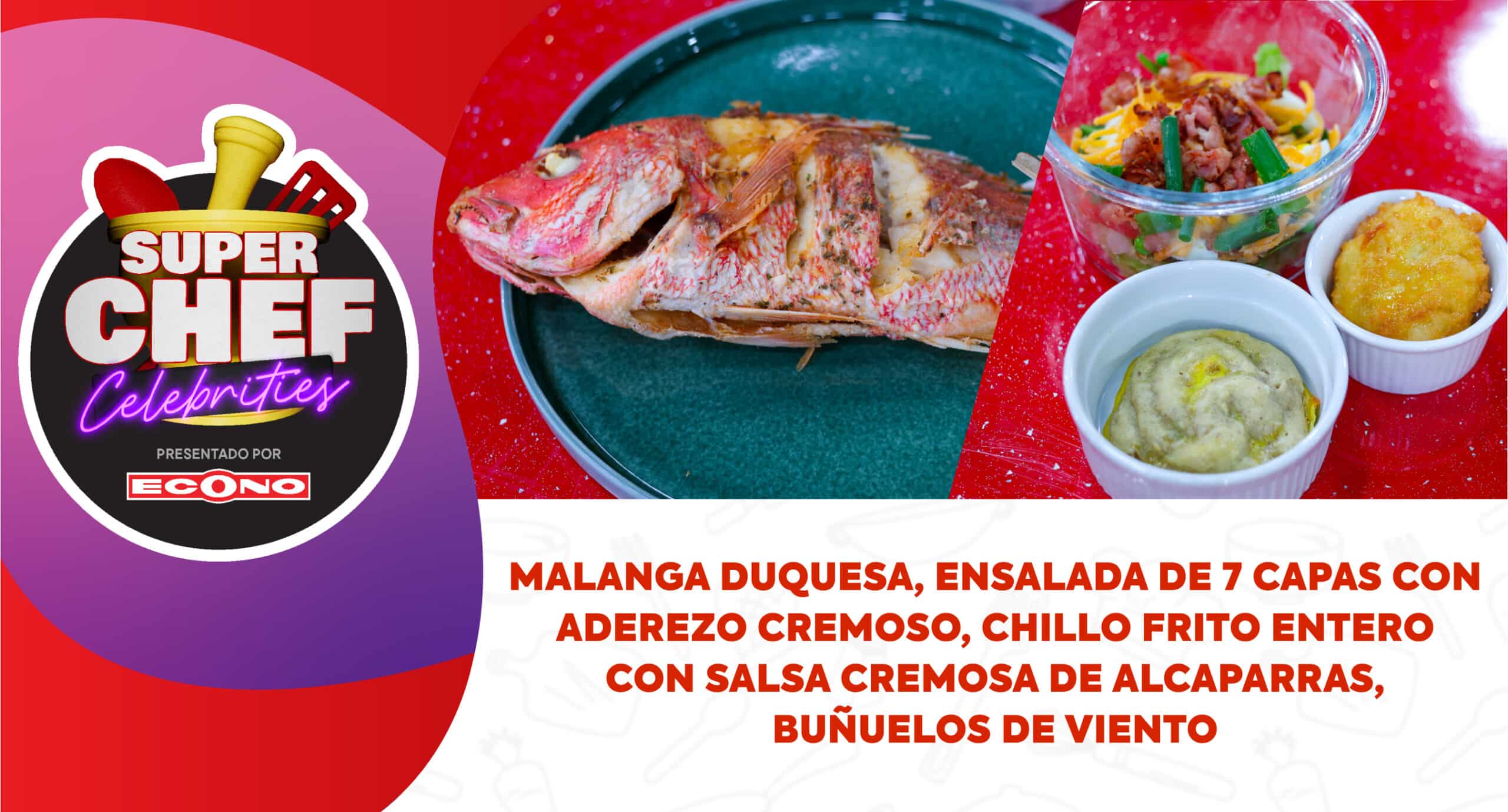 Malanga Duquesa, Ensalada de 7 Capas con Aderezo Cremoso, Chillo Frito entero con Salsa Cremosa de Alcaparras, Buñuelos de Viento