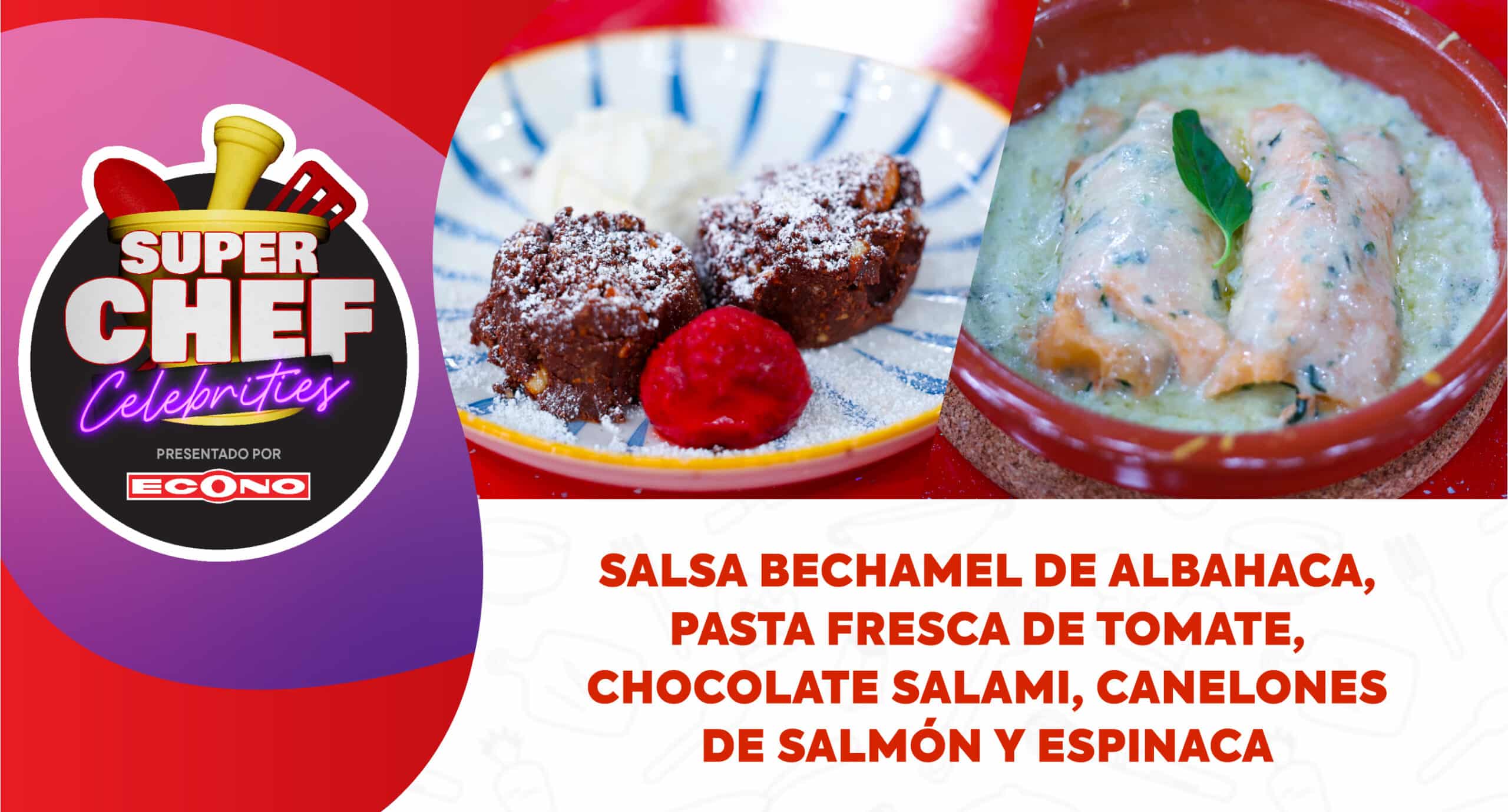 Salsa Bechamel de Albahaca, Pasta Fresca de Tomate, Chocolate Salami, Canelones de Salmón y Espinaca