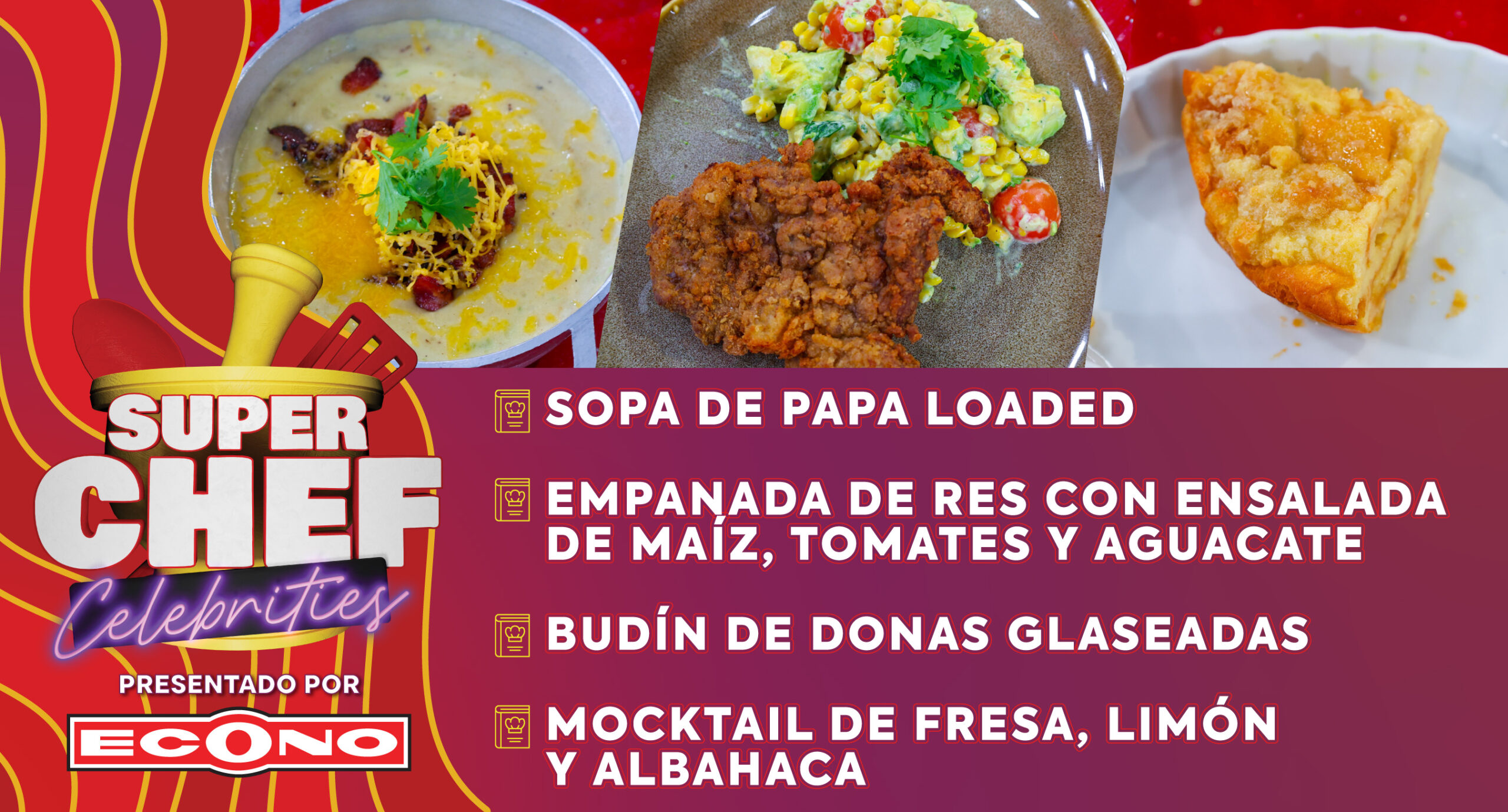 Sopa de Papa Loaded, Empanada de Res con Ensalada de Maíz, Tomates y Aguacate, Budín de Donas Glaseadas, Mocktail de Fresa, Limón y Albahaca